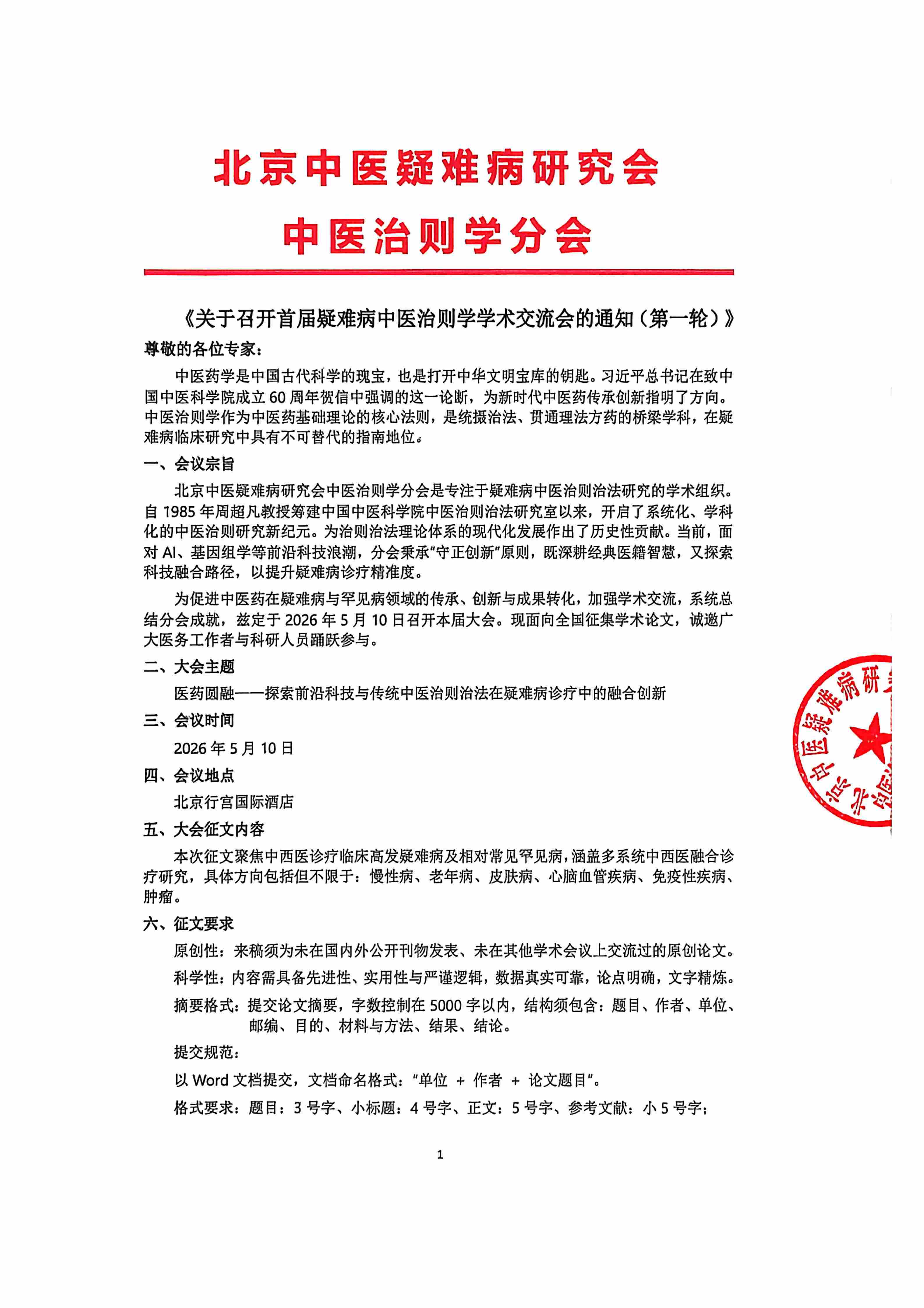 关于召开首届疑难病中医治则学学术交流会的通知(第一轮)
